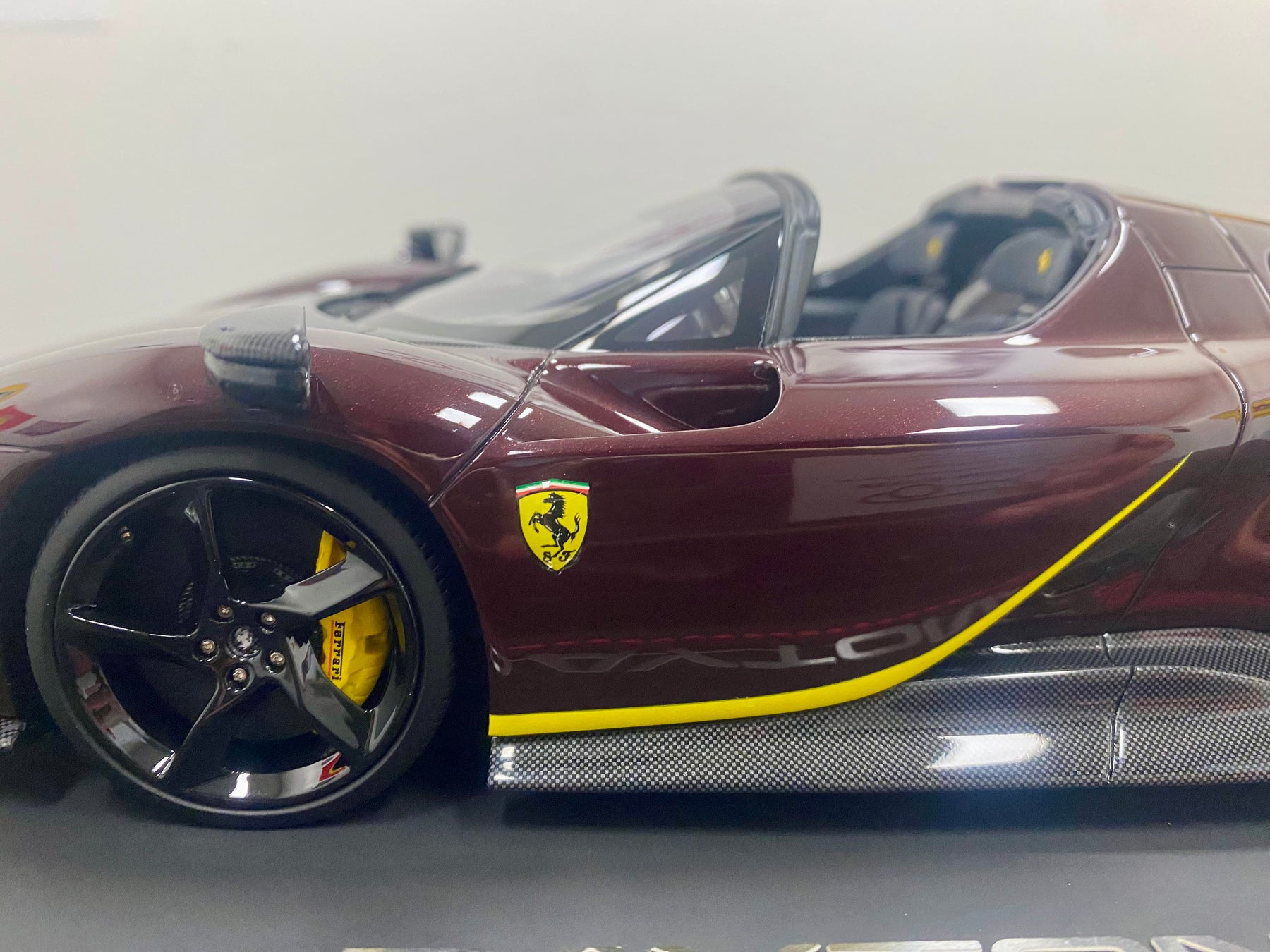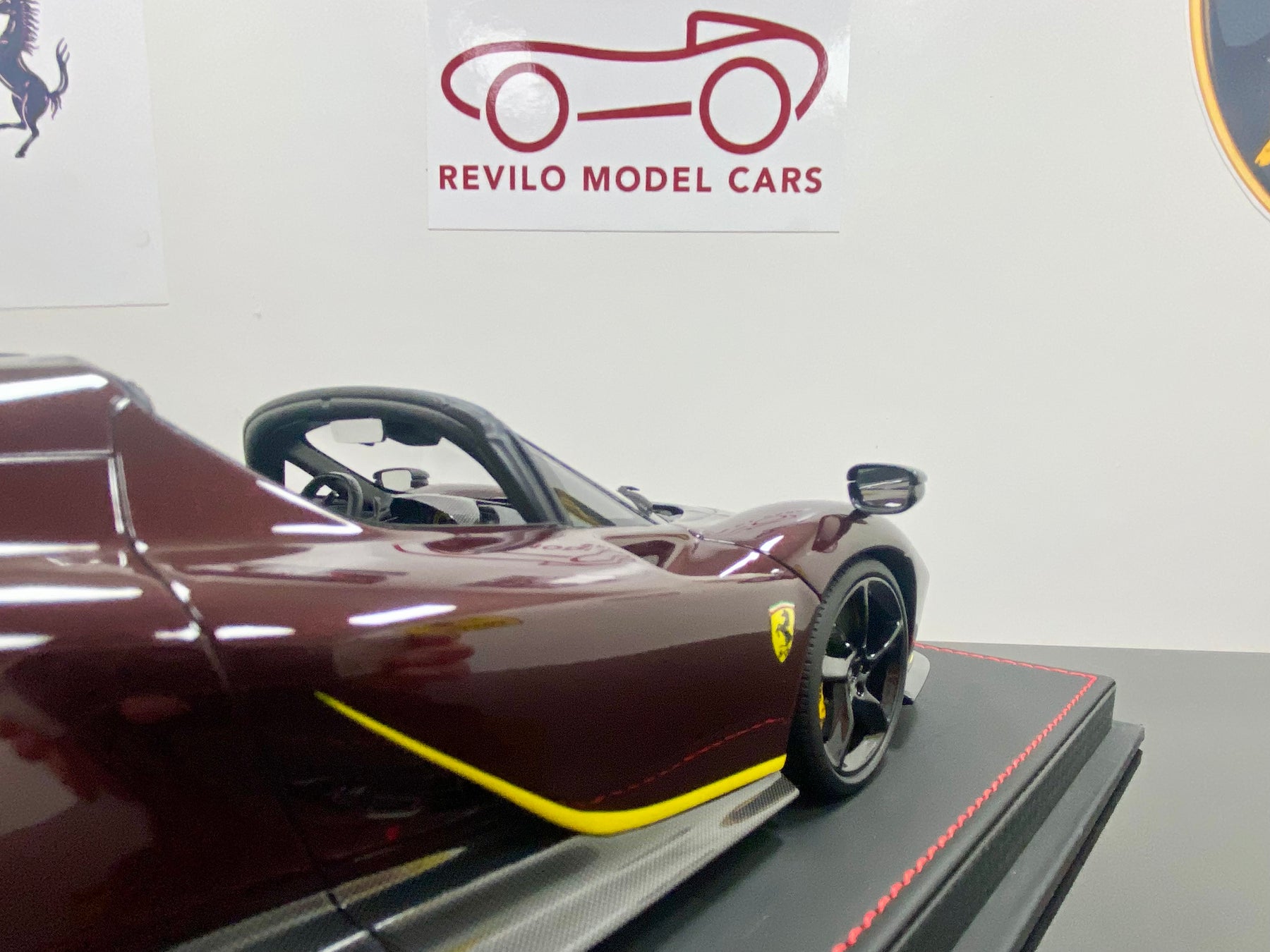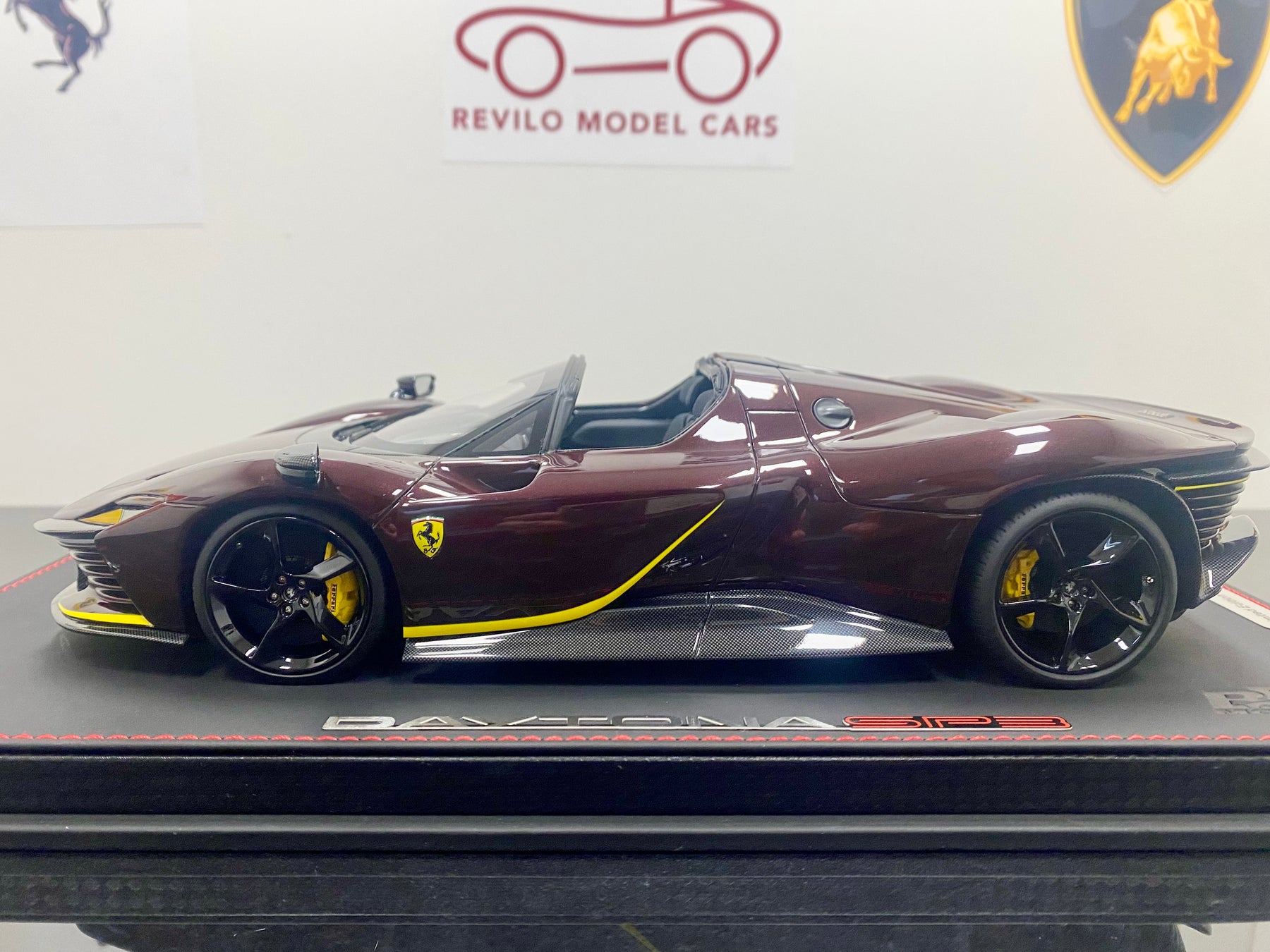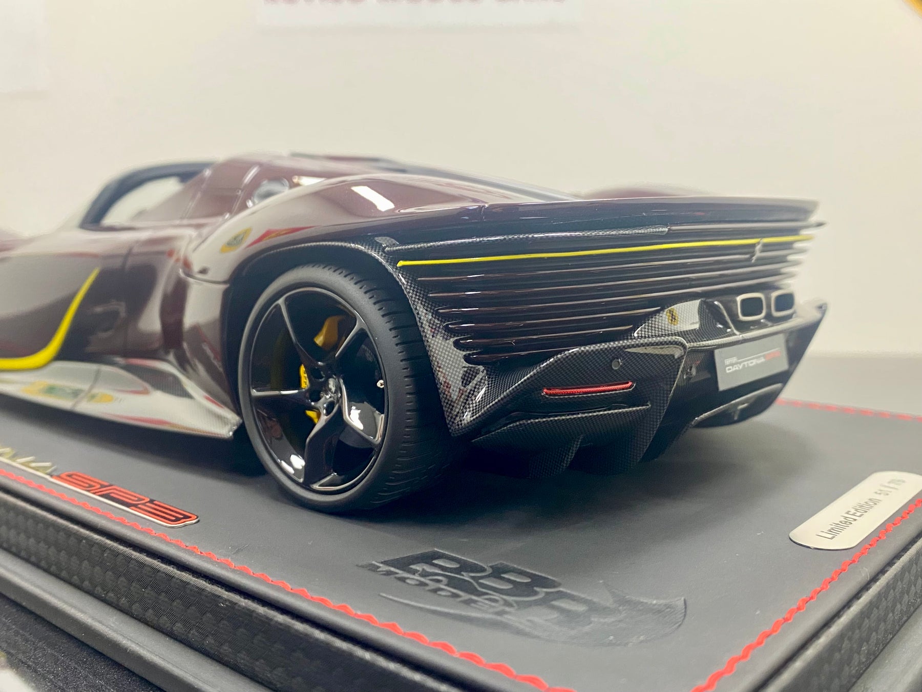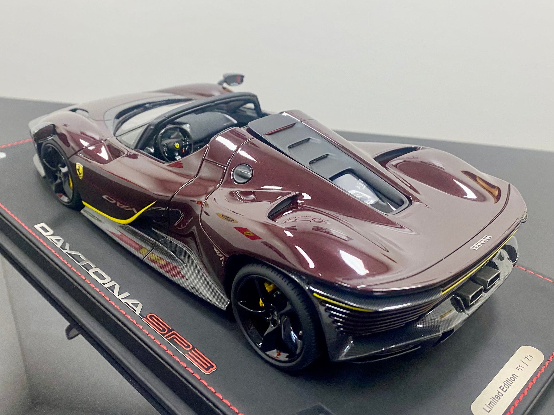 Limited Edition BBR 1:18 scale Ferrari Daytona SP3 Icona Series, only 79 models worldwide. In the rare colour Ruby Red with yellow accents, black interior, harnesses, black wheels, yellow calipers, Scuderia Shields