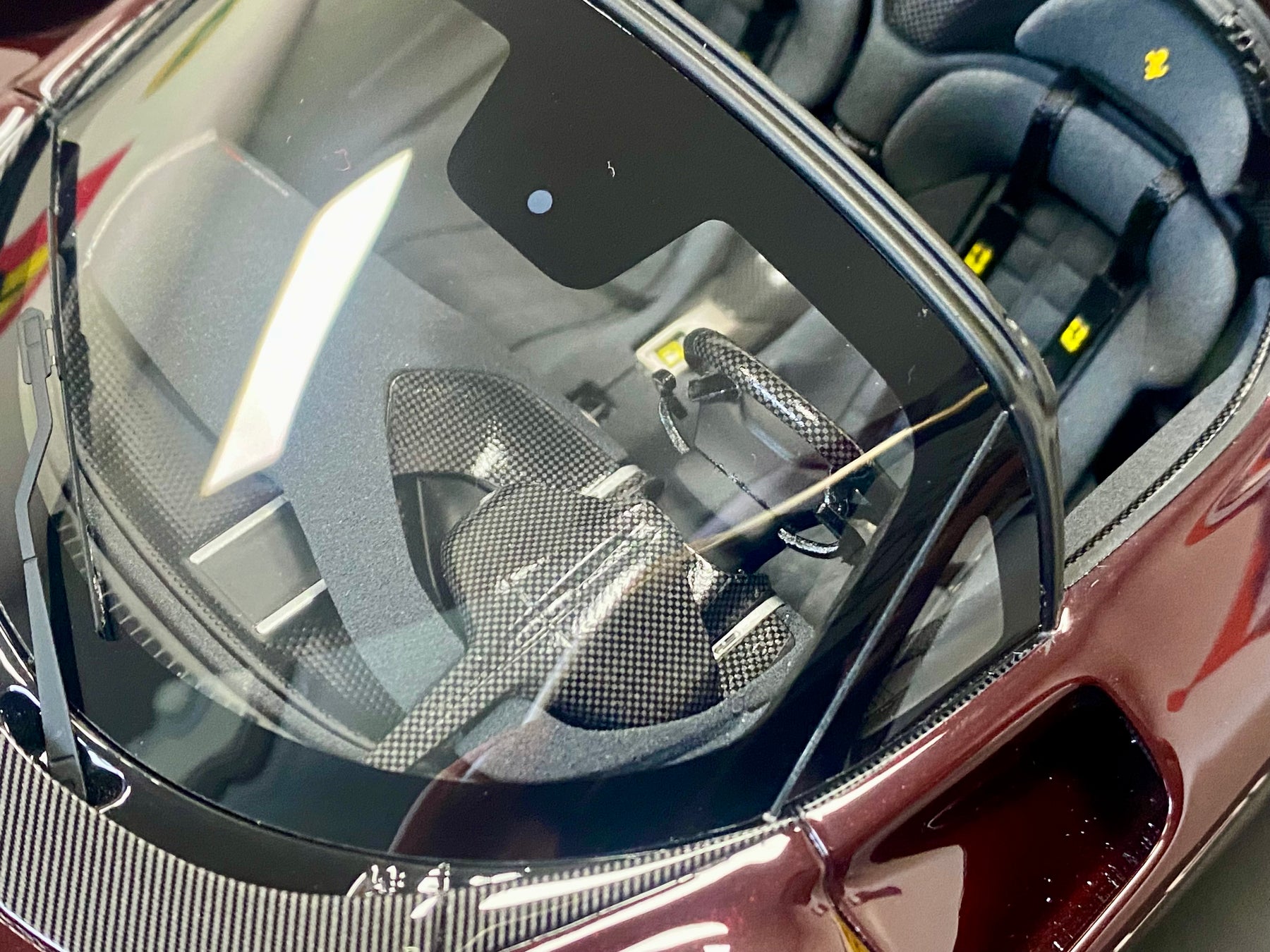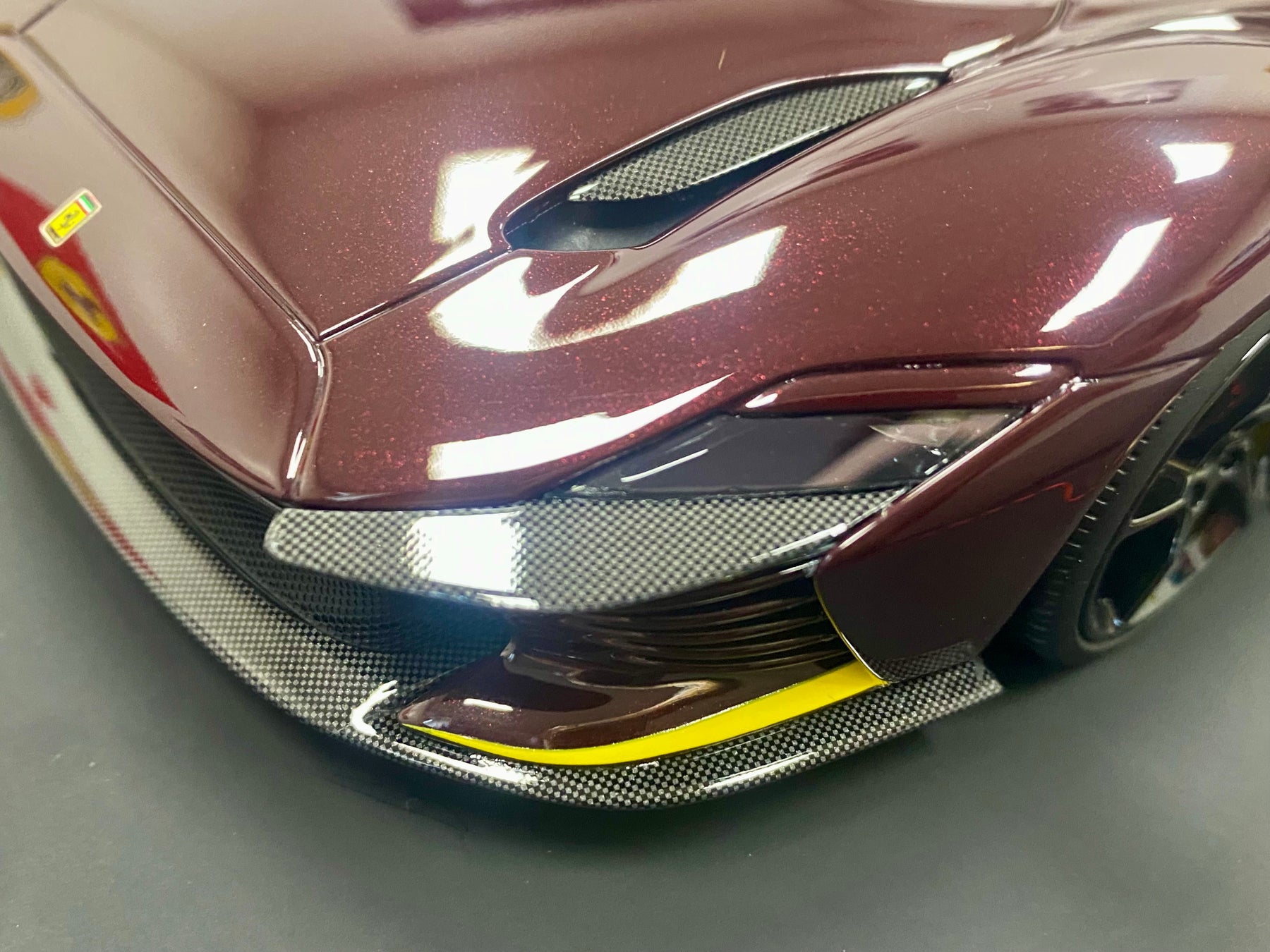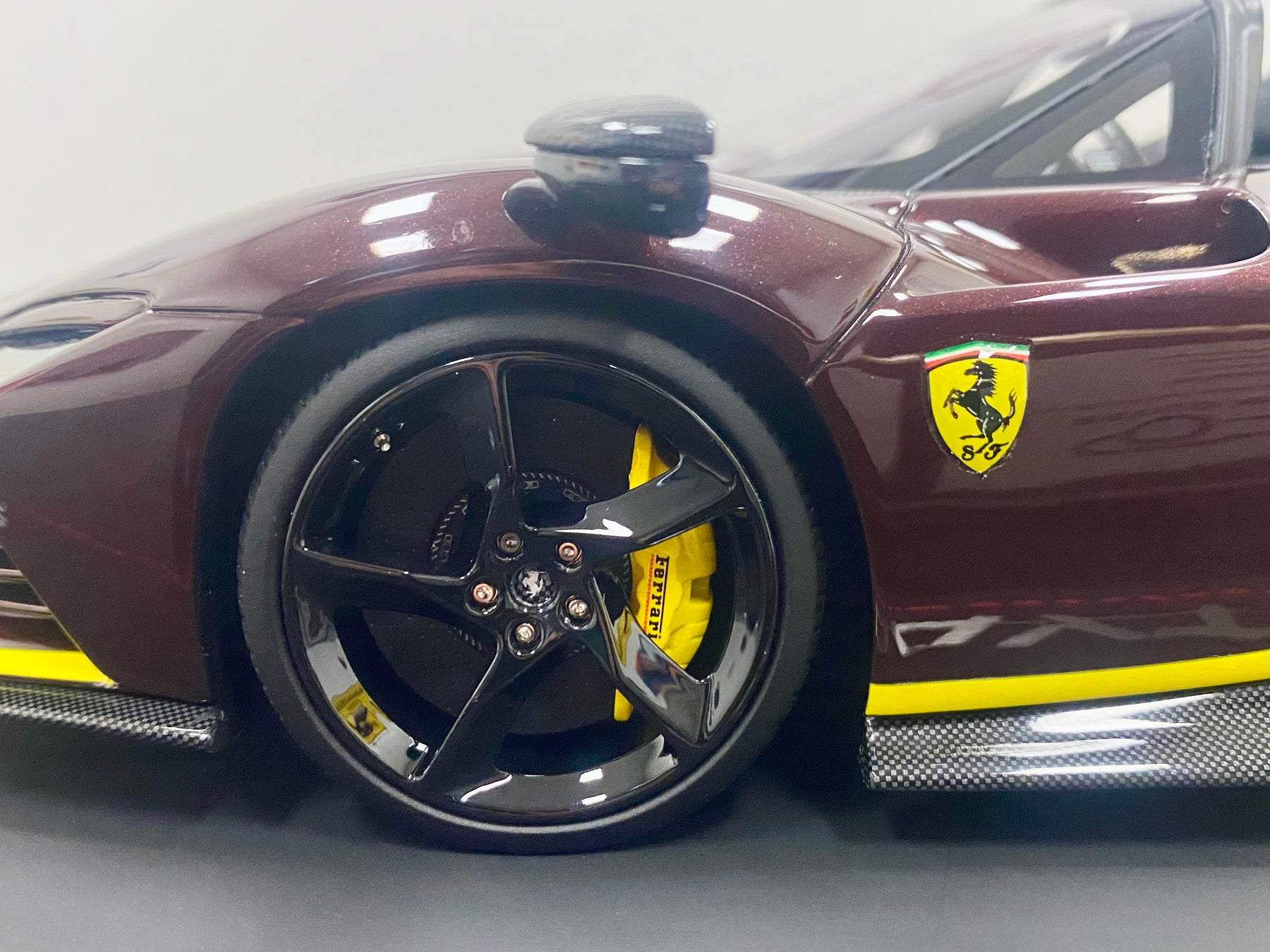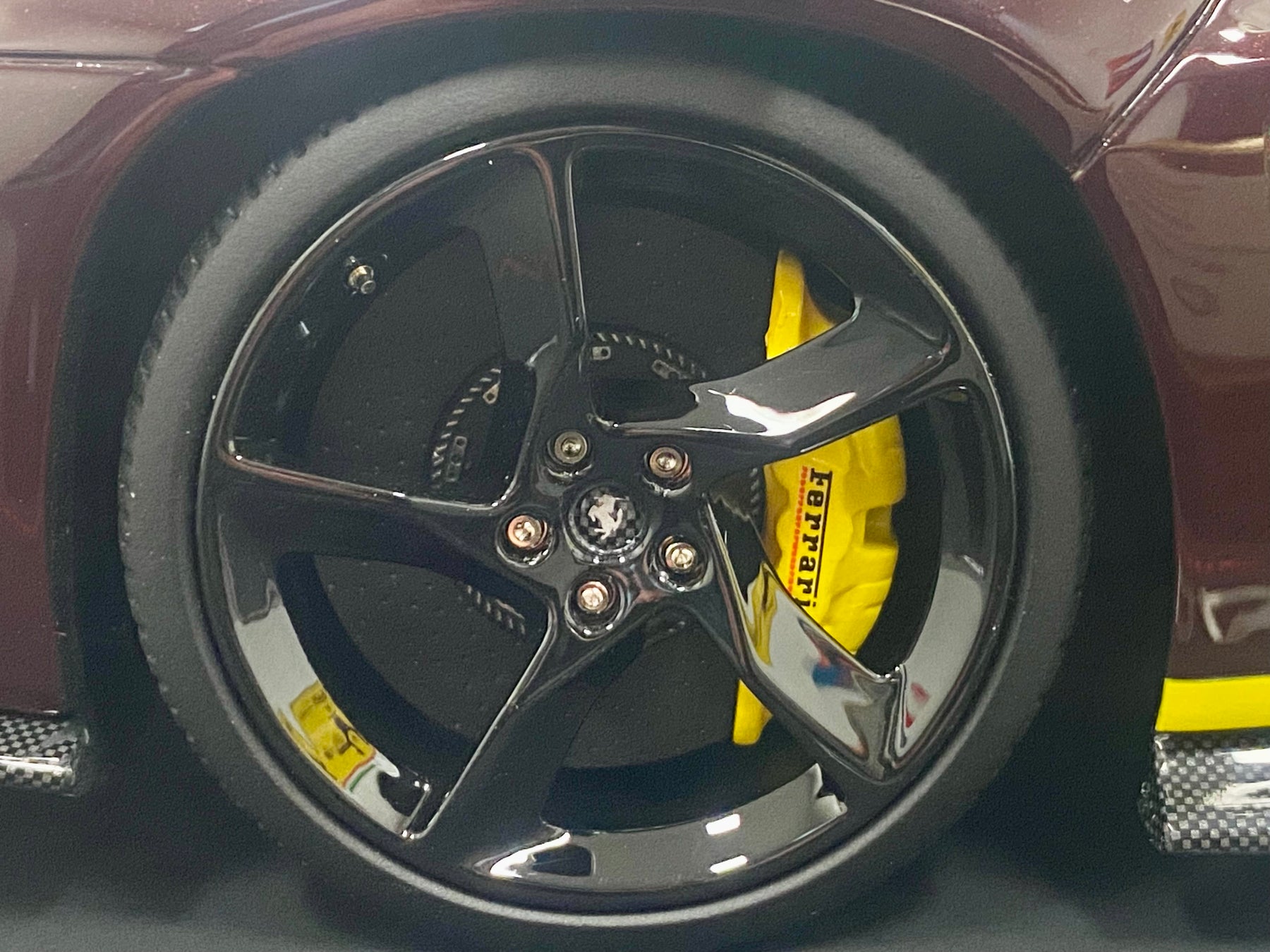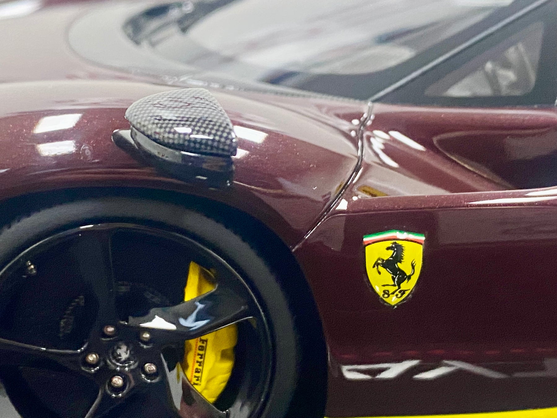 Limited Edition BBR 1:18 scale Ferrari Daytona SP3 Icona Series, only 79 models worldwide. In the rare colour Ruby Red with yellow accents, black interior, harnesses, black wheels, yellow calipers, Scuderia Shields