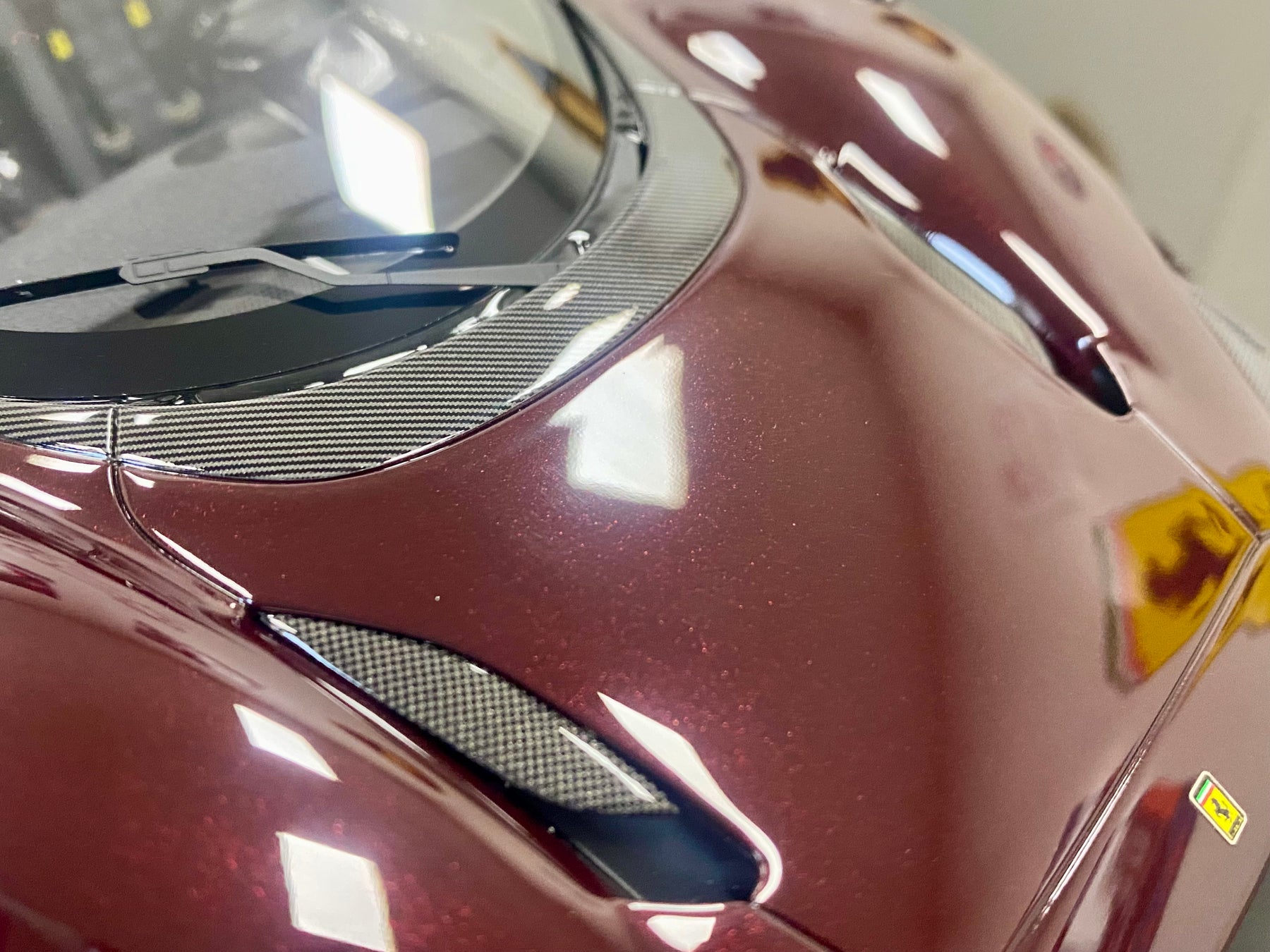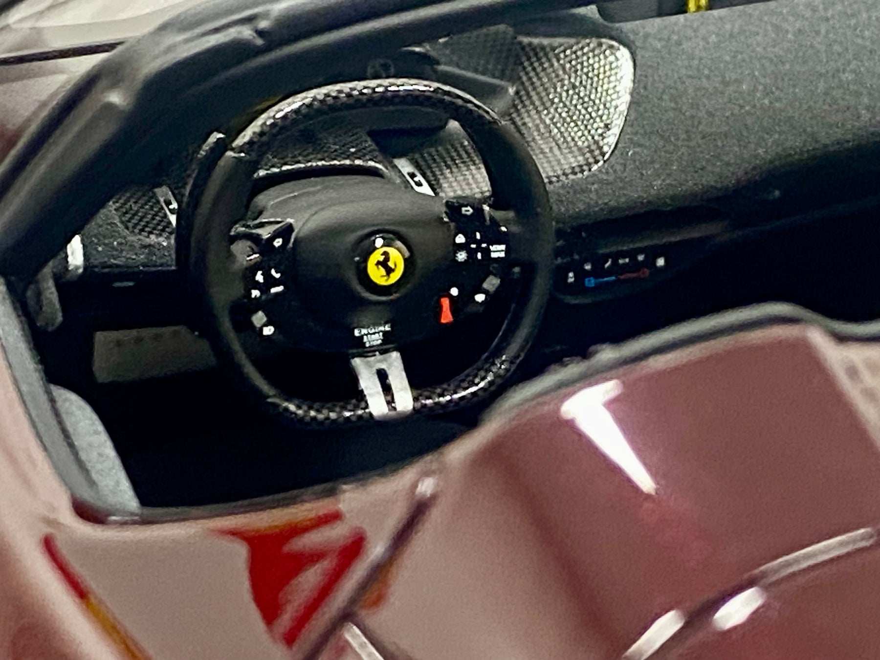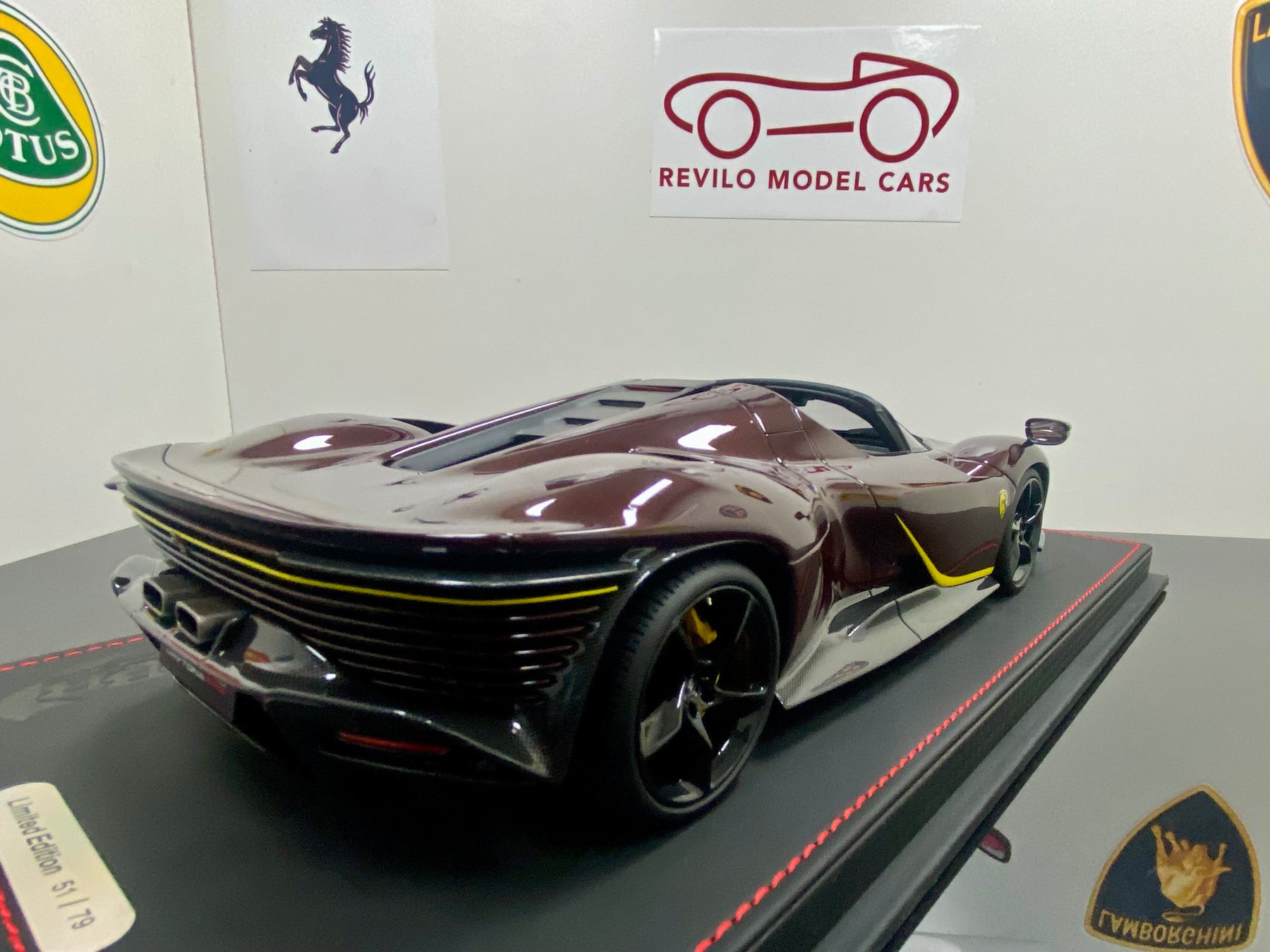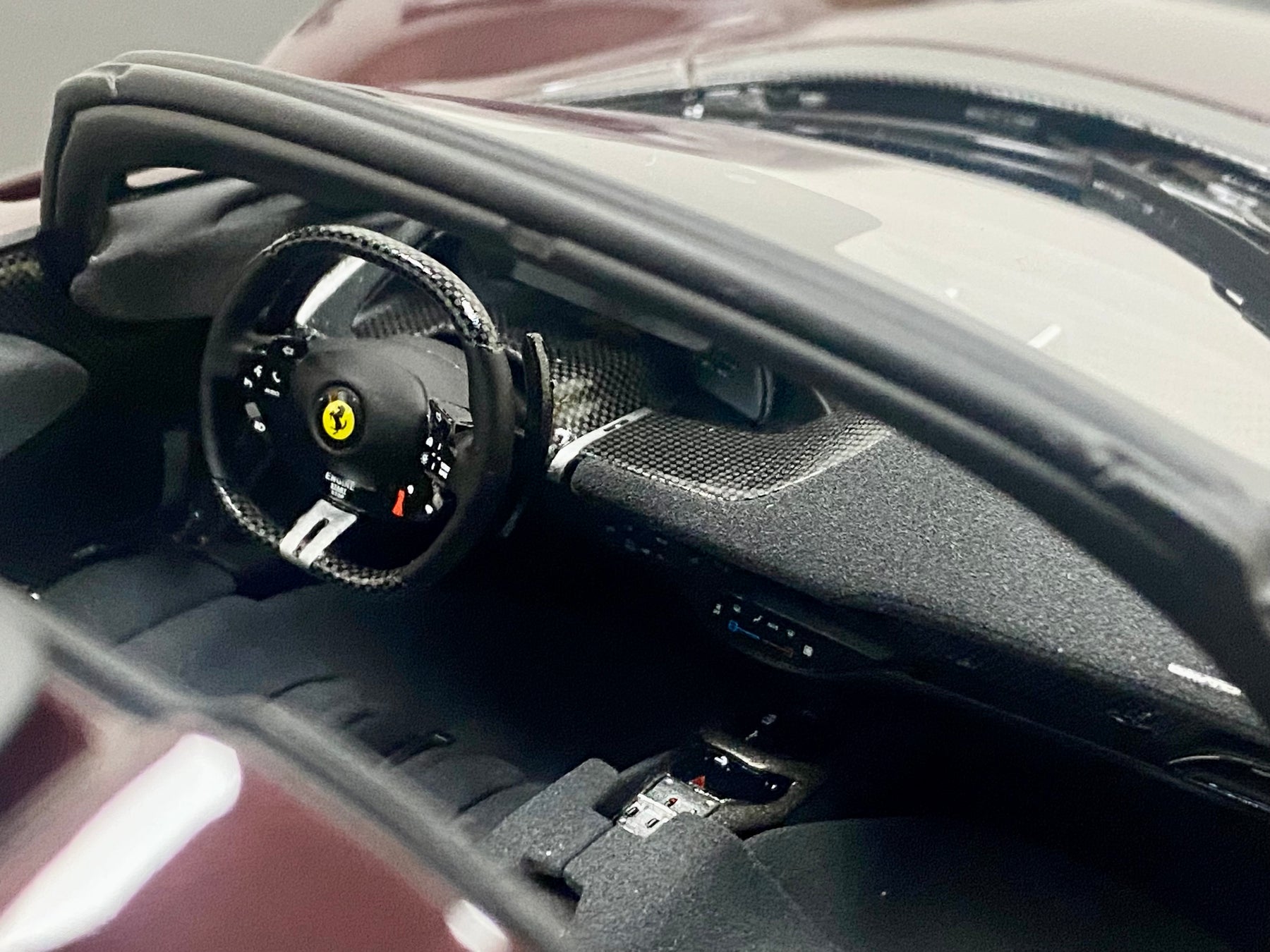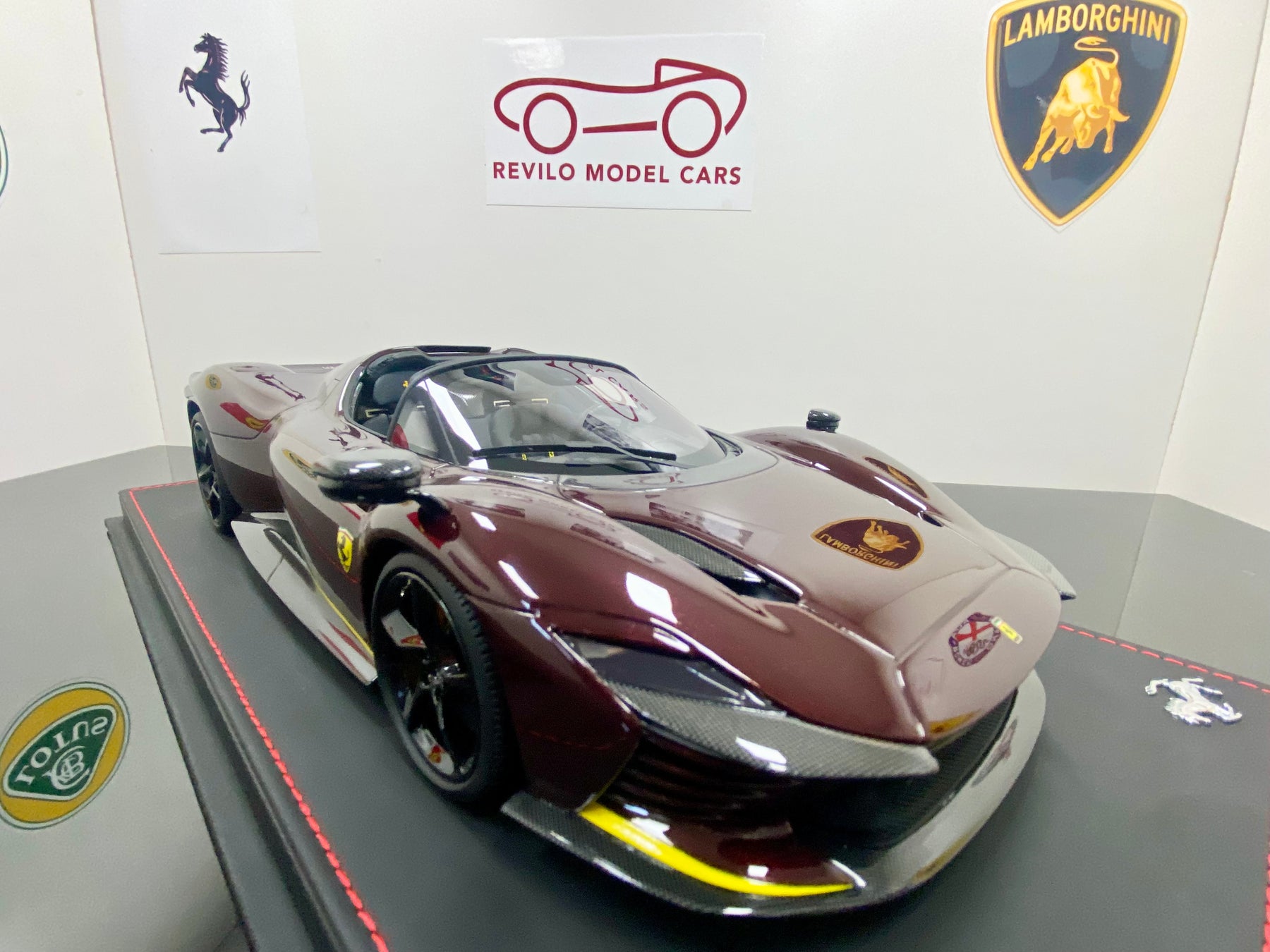 Limited Edition BBR 1:18 scale Ferrari Daytona SP3 Icona Series, only 79 models worldwide. In the rare colour Ruby Red with yellow accents, black interior, harnesses, black wheels, yellow calipers, Scuderia Shields