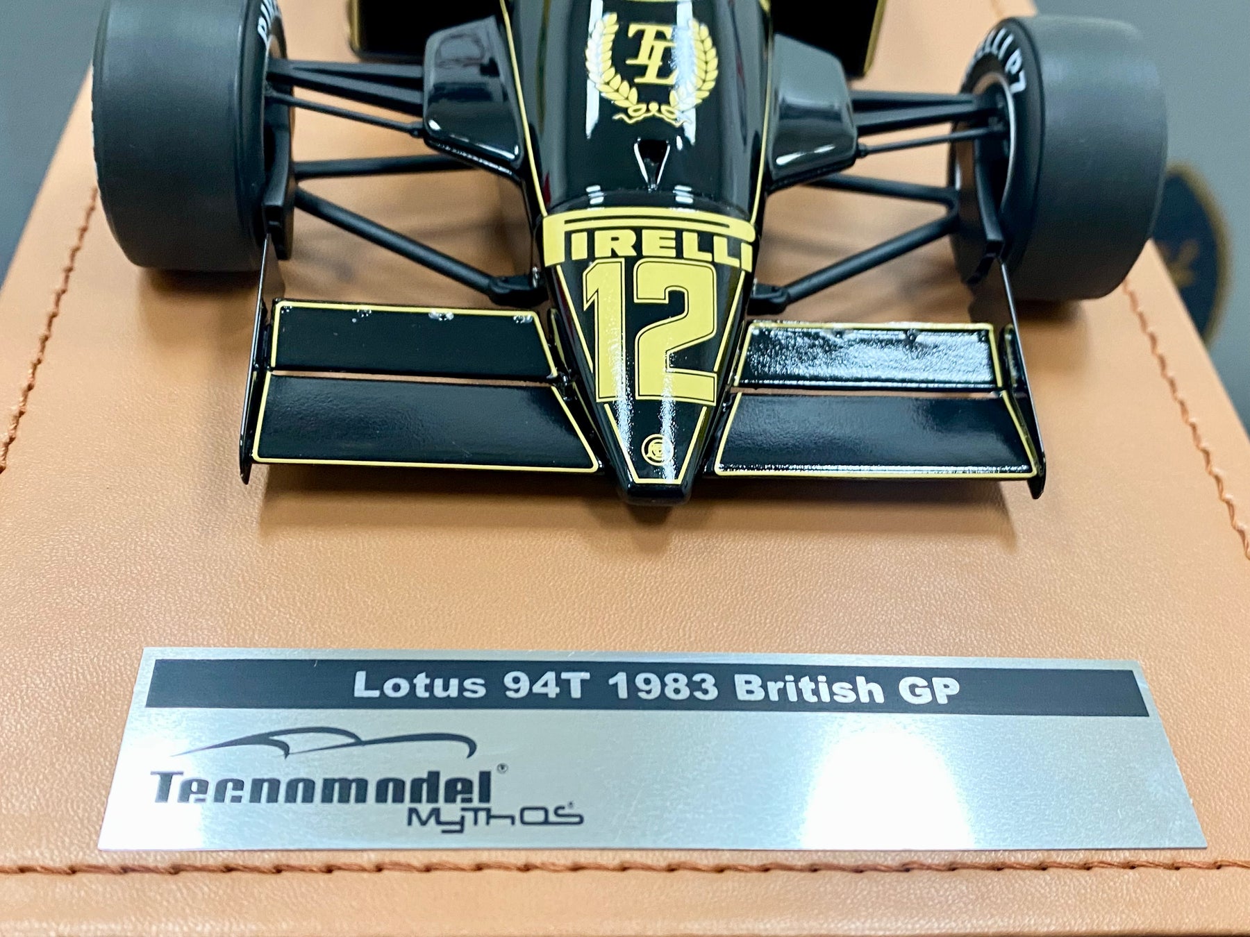 The model is mounted on a tan leatherette base with a plaque detailing the model and comes with a perspex display cover and black outer box.