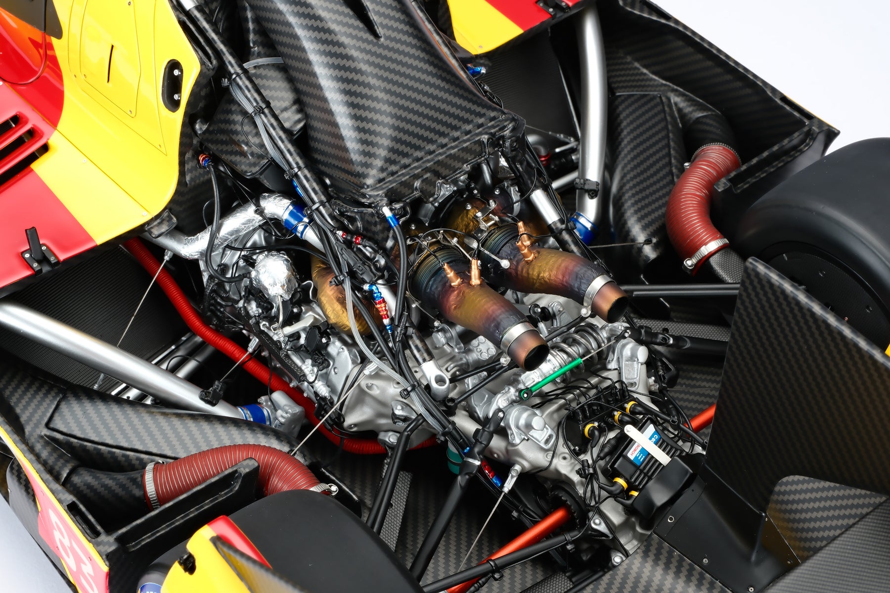 Built on an all-new carbon-fibre monocoque chassis, the 499P features solutions that represent the cutting edge of motor sport technology. Double wishbone, push-rod-type suspension provides an outstanding damping stiffness, the benefits of which are felt on the straights as well as when cornering. The electronics systems are developed from and further innovate upon the experience honed in the world of GT racing. The Hypercar features a hybrid powertrain, combining a mid-rear power unit with an electric motor powering the front axle, and is coupled to a seven-speed sequential gearbox. The 2.9-litre, twin-turbo V6 used is the same engine used in the 296 GT3 and its road-going cousins, with a maximum power output of 500kW (680cv). Added here is an Energy Recovery System (ERS) that’s connected to the front axle, and fed by a brake-by-wire system. The ERS is good for 200 kW, and the battery that powers it uses know-how accrued from Ferrari’s vast F1 experience. Among the specific characteristics of the 499P's V6 is the fact that the engine is load-bearing and therefore performs a valuable structural function, compared to the versions fitted to competition GT cars, where the engine is mounted onto the car’s rear sub-chassis.